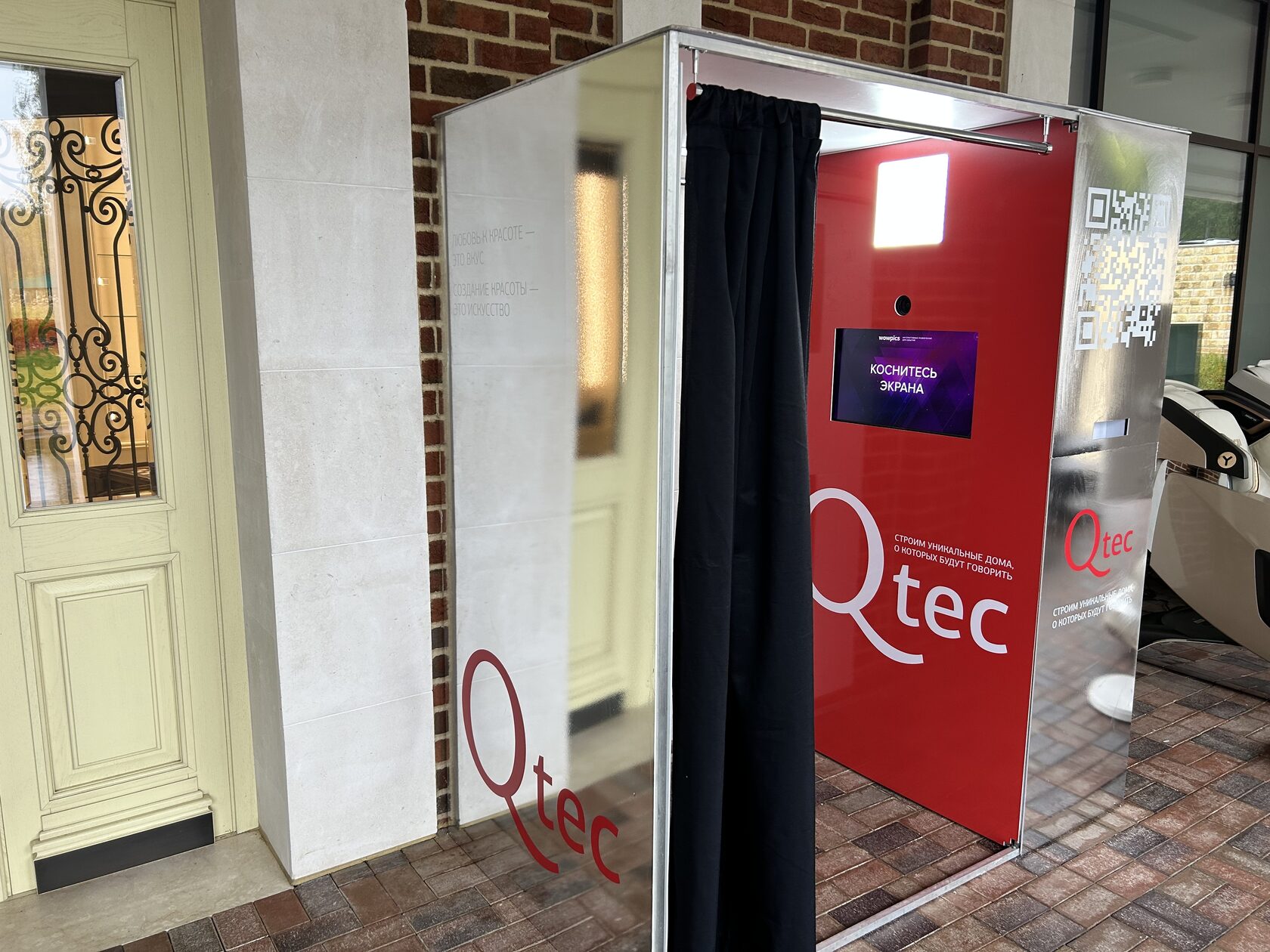 С нашей стороны была установлена большая классическая фотобудка со шторками, забрендированная в фирменном стиле заказчика с печатью по зеркальной пленке.